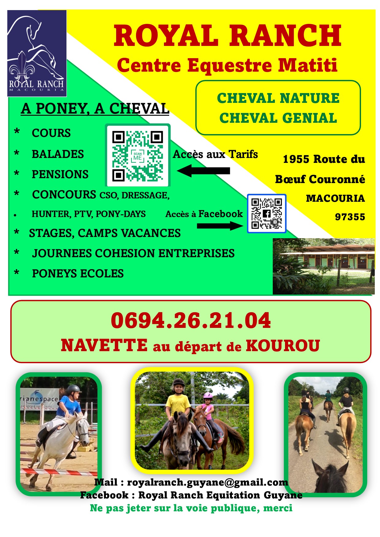 Le ROYAL RANCH CENTRE EQUESTRE MATITI, à mi-chemin entre KOUROU et MACOURIA, sur le littoral Guyanais, est un Centre Equestre en pleine nature, dans un milieu arboré, campagnard, propice pour le calme et le Bien-être des poneys et des chevaux.