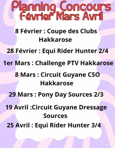 Préparation aux concours officiels FFE du Championnat de Guyane : CSO, Dressage, Hunter.